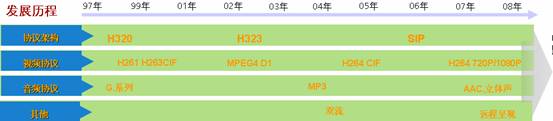 多媒體會(huì)議主要提供語(yǔ)音、視頻、數(shù)據(jù)的融合會(huì)議解決方案。傳統(tǒng)的多媒體會(huì)議在2001年前主要是專線(E1/ISDN)H.320的視頻會(huì)議系統(tǒng)。隨著寬帶(LAN/ADSL)的發(fā)展,2002年至2007年主要是H.323的視頻會(huì)議系統(tǒng),同時(shí)兼容H.320的專線視頻會(huì)議系統(tǒng)。2007年前音頻的主要是8k采樣的G.7xx協(xié)議,2007年后寬頻語(yǔ)音AAC-LD已經(jīng)普遍使用。視頻2007年前主要是4CIF格式以下的標(biāo)清系統(tǒng),2007年后H264