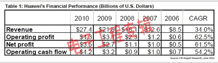 華為已經(jīng)取得了強(qiáng)大的地位,國(guó)內(nèi)外銷(xiāo)售均快速增長(zhǎng)。該公司過(guò)去四年?duì)I業(yè)收入增長(zhǎng)了兩倍以上,2010年?duì)I業(yè)收入從2006年的85億美元上升到274億美元。