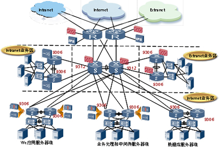 數(shù)據(jù)中心按照其功能區(qū)劃分可以分為Internet服務(wù)器區(qū)、Intranet服務(wù)器區(qū)和Extranet服務(wù)器區(qū)。