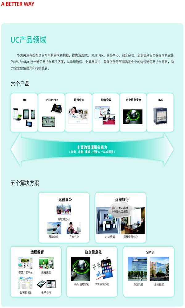 華為是全球領(lǐng)先的信息與通信解決方案供應(yīng)商。為適應(yīng)信息行業(yè)正在發(fā)生的革命性變化,華為做出面向客戶的戰(zhàn)略調(diào)整,華為的創(chuàng)新將從電信運營商網(wǎng)絡(luò)向企業(yè)業(yè)務(wù)、消費者領(lǐng)域延伸,協(xié)同發(fā)展“云-管-端”業(yè)務(wù)。