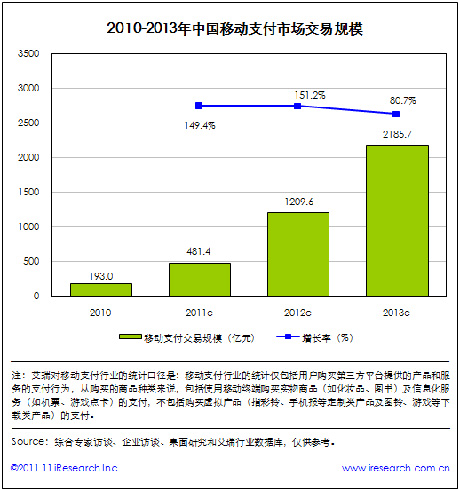 艾瑞咨詢近期推出《2011年中國(guó)移動(dòng)支付行業(yè)研究報(bào)告》,針對(duì)中國(guó)移動(dòng)支付市場(chǎng)現(xiàn)狀進(jìn)行了深入的探討。報(bào)告研究數(shù)據(jù)顯示,2011年中國(guó)移動(dòng)支付市場(chǎng)交易規(guī)模將達(dá)到481.4億元,同比增長(zhǎng)149.4%。以下截取報(bào)告觀點(diǎn)進(jìn)行詳細(xì)解讀:
