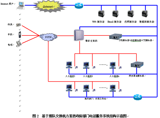 政府部門電話服務(wù)系統(tǒng)是一個(gè)集合電話語音、計(jì)算機(jī)網(wǎng)絡(luò)、數(shù)據(jù)庫(kù)等技術(shù)的綜合信息服務(wù)平臺(tái),主要由自動(dòng)語音應(yīng)答系統(tǒng)、人工座席和數(shù)據(jù)庫(kù)系統(tǒng)三部分組成。