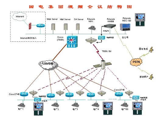 128,集團下屬60個電廠均采用視頻終端ViewStation 128。整個網(wǎng)絡(luò)采用Polycom MCU的混速功能,在本部中心采用768Kbps進行視頻傳輸,和下屬60個電廠及分公司采用128Kbps進行傳輸。由于網(wǎng)絡(luò)傳輸線路分為衛(wèi)星線路和地面有線網(wǎng)絡(luò),衛(wèi)星線路帶寬為768Kbps-1Mbps,用于業(yè)務(wù)下行線路,地面有線網(wǎng)絡(luò)128Kbps用于視頻回傳。根據(jù)網(wǎng)絡(luò)傳輸線路的實際情況,在本部中心利用1臺視頻終端將其模擬信號(AV信號)送到衛(wèi)星端接設(shè)備(包含MODEM,編解碼器等),將模擬信號轉(zhuǎn)換成數(shù)字信號(MPEG4),利用768K-1Mbps衛(wèi)星線路廣播到每個接收點,通過每個接收點的編解碼器將數(shù)字信號轉(zhuǎn)換成模擬信號連接到顯示終端(如TV、顯示器)上進行收看,通過這種方式可以實現(xiàn)利用衛(wèi)星線路的高帶寬,并利用其廣播特性,節(jié)省投資。
