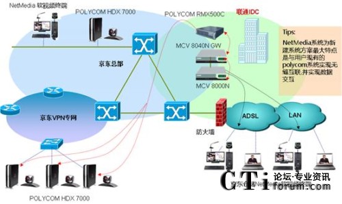 京東商城的NetMedia軟視頻會議MCU設(shè)備MCV8000N安裝在聯(lián)通的IDC,有10個倉儲的網(wǎng)絡(luò)視頻會議室安裝硬件終端MCV2000N,另外40個倉儲是在網(wǎng)絡(luò)視頻會議室的PC機(jī)上安裝一套NetMedia客戶端程序,各會議室終端通過ADSL撥號、3G無線上網(wǎng)、公司VPN專網(wǎng)等方式接入NetMedia軟視頻會議MCU。該系統(tǒng)以良好的網(wǎng)絡(luò)適應(yīng)性運(yùn)行在互聯(lián)網(wǎng)上,可保證音視頻低延時、高保真的交互,使各倉儲間的技術(shù)交流和庫存數(shù)據(jù)交換常態(tài)化,為各地倉儲間庫存數(shù)據(jù)交換、貨物調(diào)配提供了實時、快捷的溝通渠道。