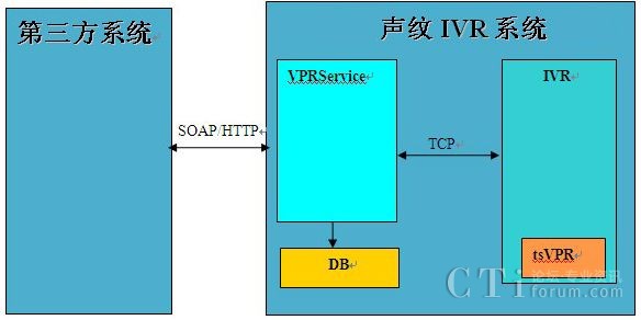 本系統(tǒng)主要由三部分組成:VPRService、IVR、tsVPR,其中VPRService的功能是負(fù)責(zé)跟外部其它系統(tǒng)(第三方軟件)交互和資料的管理;IVR的功能主要是負(fù)責(zé)系統(tǒng)業(yè)務(wù)流程;tsVPR是天聰聲紋識(shí)別引擎,負(fù)責(zé)聲紋登記和聲紋識(shí)別。