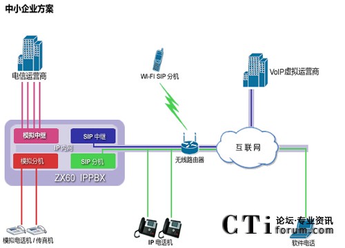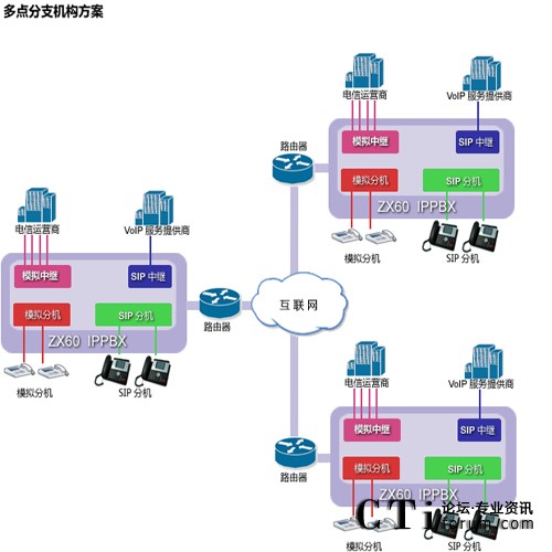 ZX60不僅具有本地電話分機接口,還運行IP電話機遠程注冊,無論你若干個辦公室分布在何處,都可以打造成你內(nèi)部免費通話的集團電話通信系統(tǒng),節(jié)約你的內(nèi)部通信成本,提高辦公效率。