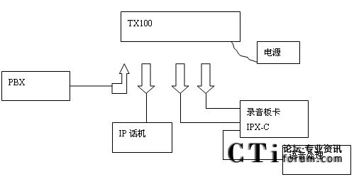 IP話機(jī)的錄音示意圖和圖1-4 E1/T1數(shù)字線錄音示意圖類似。不過此時(shí)PBX與IP話機(jī)之間的連線改成網(wǎng)線(RJ45)了。并且在兩個(gè)設(shè)備之間多了個(gè)并接設(shè)備TX100,其示意圖如下: