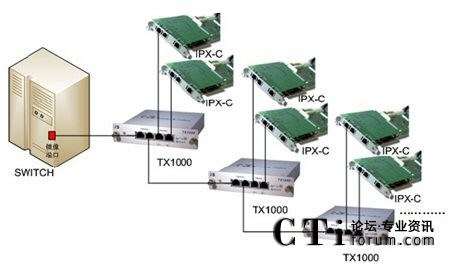 在上圖中,TX1000上Network其中一個(gè)端口與交換機(jī)鏡像口或Switch設(shè)備直接相連,Network的另一個(gè)端口與另一個(gè)switch相連,該switch下相連好多IP話機(jī)。Monitor中的ATx端口與一塊IP錄音板卡相連,另一端口BTx與第二塊IP錄音板卡相連。這樣就做到了IP錄音的冗余備份。