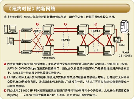 VoIP架構(gòu)是基于北電的通信服務(wù)器CS 1000平臺(tái),該平臺(tái)是一種基于服務(wù)器的IP PBX。CS 1000是基于北電的Meridian PBX特性集合,其主機(jī)運(yùn)行在一臺(tái)來(lái)自WindRiver系統(tǒng)公司的VxWorks實(shí)時(shí)操作系統(tǒng)的IP服務(wù)器上。一對(duì)冗余的CS1000將為新聞、廣告、發(fā)行和其他部門(mén)中大約3600 部IP電話(huà)以及部署在《紐約時(shí)報(bào)》的分類(lèi)/顯示廣告呼叫中心的300部IP軟電話(huà)提供服務(wù)。CS 1000提供對(duì)34臺(tái)以上的媒體網(wǎng)關(guān)和18臺(tái)信令服務(wù)器(部署在網(wǎng)絡(luò)中為內(nèi)網(wǎng)連接的不同部門(mén)提供VoIP呼叫建立和信令的分布式專(zhuān)用設(shè)備)的集中管理。