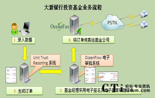 大新銀行采用OceanFax傳真服務(wù)器收發(fā)電子傳真,并將OceanFax與Unit Trust Reporting 系統(tǒng)及OceanFlow電子審批系統(tǒng)整合,理順投資基金流程,包括訂單生成、審批及傳真發(fā)送,實現(xiàn)完美自動流程,提高效率、降低成本及保證信息安全。