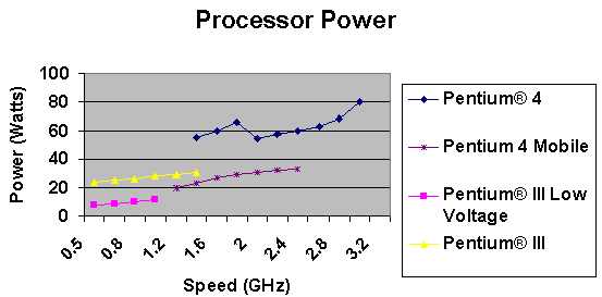 在CompactPCI演進(jìn)的歷史軌跡中,x86處理器已經(jīng)經(jīng)歷過非常顯著的變化。有些非常早期的卡板用的是66MHz的CPU,目前這一代的x86產(chǎn)品,包含了1.7GHz Mobile Pentium 4 CPU。在嵌入式工業(yè)對(duì)支持長(zhǎng)生命周期的產(chǎn)品需求,造成了產(chǎn)品制造廠在處理器的選擇上,傾向從嵌入式或有長(zhǎng)周期支持的產(chǎn)品線去選擇。這些產(chǎn)品并不像桌上型計(jì)算機(jī)或服務(wù)器的處理器那樣走得那么先端,這些產(chǎn)品的生命周期是用年而不是用月來計(jì)算的。此外,這個(gè)產(chǎn)業(yè)也藉由使用mobile processor而取得一些優(yōu)勢(shì),這種處理器在電源供應(yīng)的需求上和嵌入式以及電信領(lǐng)域的應(yīng)用非常類似。下圖提供了Pentium各系列的處理器與其功率消耗的一個(gè)關(guān)連性,可以看到Pentium III與Mobile Pentium 4處理器家族的產(chǎn)品符合了今日CompactPCI板卡對(duì)處理器所提供的30Watts功率規(guī)格。