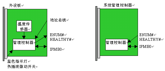 IPMB被運(yùn)用到在系統(tǒng)管理控制器和CompactPCI單板板載管理控制器之間傳送指令,對(duì)于IPMB上承載的指令的定義和格式由IPMI規(guī)范版本 1.5版本規(guī)范描述。IPMI規(guī)范設(shè)計(jì)參照服務(wù)器主板環(huán)境,在一個(gè)典型的主板上,管理控制器與許多位于主板上、機(jī)箱內(nèi)的啞元傳感器相聯(lián)。指令集包含針對(duì)于這種環(huán)境中傳感器的處理,數(shù)據(jù)的存儲(chǔ),日志以及看門狗定時(shí)器的定制指令。盡管IPMI指令集對(duì)主板環(huán)境來說比較適合,但它不具備提供對(duì)獨(dú)立于硬件之外的數(shù)據(jù)的能力。在2002年五月, PICMG 2.9規(guī)范得到了進(jìn)一步的改善,增補(bǔ)了一份變更通知,解決了最初2.9規(guī)范中的一些缺陷。ECR致力于定義一種就軟件來說與硬件無關(guān)的機(jī)制,這種機(jī)制能判別背板的容量以及哪個(gè)槽位已經(jīng)插入了CompactPCI單板。位于一個(gè)標(biāo)準(zhǔn)CompactPCI單板上的管理控制器可能會(huì)和地址總線、位于單板把手上熱插拔微動(dòng)開關(guān)、藍(lán)色的熱插拔燈、甚至是HEALTHY和ENUM#信號(hào)聯(lián)通。典型的系統(tǒng)管理控制器板與位于外設(shè)板上的管理控制器的聯(lián)接如下圖3所示: