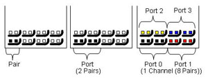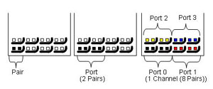 接口的最小連接單元。端口的兩對(duì)差分信號(hào)被映像成一收一發(fā)的傳輸模式。下圖描繪了一個(gè)差分對(duì)、一個(gè)埠、以及一個(gè)通路的針腳分布: