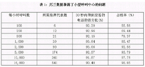 這張厄蘭表生動地說明了當(dāng)呼叫中心規(guī)模增長是其效率的迅速增長。這張表對應(yīng)的情況是這樣的:處理每一個呼叫的平均時間是2分鐘。要實現(xiàn)的目標(biāo)是90%的呼叫要在30秒內(nèi)得到應(yīng)答。第一列顯示了呼叫量的增長,第二列顯示了相對于特定的呼叫量,為達(dá)到指定的服務(wù)水平,在該厄蘭模型下所需的最少座席代表數(shù)。