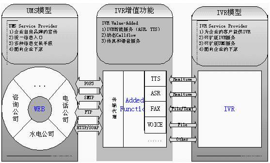 。ǘ㊣VR系統(tǒng)的傳統(tǒng)缺點是缺乏智能化,流程更改困難,播放的語音或者內(nèi)容必須預(yù)先錄制.所以我們提供UMS服務(wù),增強IVR的功能. 使我們的IVR功能增強(Ext-IVR Service Provider)