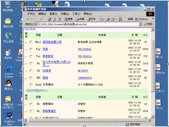 傳統(tǒng)郵件系統(tǒng)作為信息交換的手段在PC后的互聯(lián)網(wǎng)絡(luò)時代廣為運用,但是,郵件系統(tǒng)一個大的缺點是離不開電腦。CTI技術(shù)技術(shù)通過傳統(tǒng)的電話網(wǎng)絡(luò)傳遞語音信息。電話網(wǎng)具有廣泛普及,人人使用這一特點,這兩大技術(shù)的發(fā)展促使兩大技術(shù)的融合,那就是隨時隨地(anytime and anywhere)人們都可以通過電話,電腦使用郵件,訪問郵件。