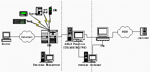 傳統(tǒng)UMS的分散的網(wǎng)民,而IVR, UMS服務(wù)提供商的客戶是企業(yè),系統(tǒng)的使用者則是企業(yè)的客戶(即系統(tǒng)面向下家,由下家為最終客戶提供服務(wù)),分離的模式可以有兩個獨立的企業(yè)來運營系統(tǒng),IVR Service由具有電信資源的企業(yè)(如:具有接入號,有電信中繼資源,還有CTI系統(tǒng)建設(shè)經(jīng)驗)運營。UMS Service由ISP企業(yè),網(wǎng)站門戶企業(yè)等在互聯(lián)網(wǎng)絡(luò)有建設(shè)經(jīng)驗的企業(yè)運營。兩家企業(yè)密切合作。共同提供完善的統(tǒng)一的信息服務(wù)。
