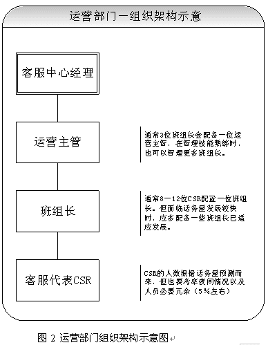 關(guān)于團(tuán)隊(duì)的建設(shè),應(yīng)該首先考慮組織架構(gòu)的設(shè)立。從運(yùn)營角度講,設(shè)置客服中心經(jīng)理、運(yùn)營主管、班組長、客服代表都是必須的。當(dāng)然根據(jù)不同的規(guī)模,也可以增加或者減少層級。具體建議請見圖2所示。除了運(yùn)營之外,對于大型呼叫中心(50坐席以上,或者業(yè)務(wù)較為復(fù)雜的),也應(yīng)考慮相關(guān)部門的設(shè)立。比如客戶關(guān)注組,可以負(fù)責(zé)疑難問題解決、工單流轉(zhuǎn)、投訴處理、建議處理、知識(shí)庫建設(shè)采編等等;培訓(xùn)組可以負(fù)責(zé)管理、組織、實(shí)施員工培訓(xùn);技術(shù)維護(hù)組可以負(fù)責(zé)系統(tǒng)維護(hù)、網(wǎng)絡(luò)維護(hù)、新項(xiàng)目應(yīng)用界面開發(fā)、部分系統(tǒng)優(yōu)化;綜合行政可以負(fù)責(zé)人事、行政等事務(wù)。