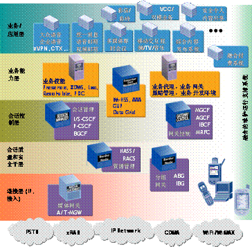 阿爾卡特朗訊會話管理實現(xiàn)IMS的P-CSCF、I/S-CSCF和BGCF的功能,網(wǎng)關控制包括MGCF和IBCF。會話管理支持2G/3G的GGSN、CAMD的PDSN、WLAN的PDG、固定有/無線的ABG的接入和會話處理。網(wǎng)關控制MGCF負責與傳統(tǒng)交換網(wǎng)絡PSTN和PLMN的互通,IBCF負責與VoIP網(wǎng)絡、IMS網(wǎng)絡和其他基于IP的多媒體網(wǎng)絡互通。接入網(wǎng)關控制實現(xiàn)電話仿真系統(tǒng)的功能。它控制A-MGW接入傳統(tǒng)固定終端,通過IMS的電話業(yè)務服務器提供各類電話基本業(yè)務和補充業(yè)務。