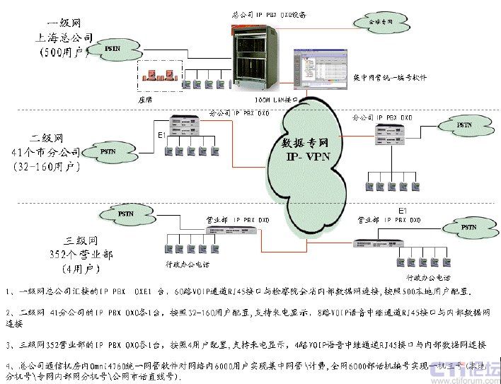 套Omni PCX Office(面向中小型機(jī)構(gòu)的通信平臺(tái))系統(tǒng)分別為4-160 用戶作為分支交換節(jié)點(diǎn)。全網(wǎng)總計(jì)多達(dá)6000