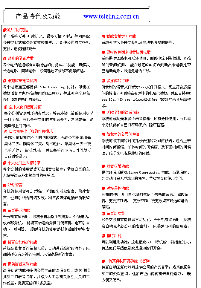 系統(tǒng)可提供直撥分機(jī),呼叫器,電話,移動(dòng)電話或點(diǎn)留言燈的方式通知分機(jī)主人有留言,聽完留言即滅燈