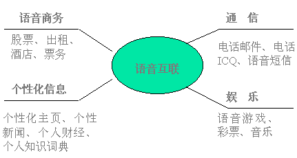 在中國,電話有著最廣泛的用戶群;追求方便時尚,希望使用互聯(lián)網(wǎng)信息、郵件而不懂或不熟悉鍵盤操作的用戶占4/5;語音互聯(lián)網(wǎng)是電話網(wǎng)與互聯(lián)網(wǎng)的完美結(jié)合,通過語音互聯(lián),普通電話用戶用自然語言對話的方式即可獲取互聯(lián)網(wǎng)的主要服務(wù),滿足用戶任何時間、任何地點、任何設(shè)備獲取信息的需求。在美國、日本,語音互聯(lián)已成為簡易終端接入互聯(lián)網(wǎng)的主要方式之一。