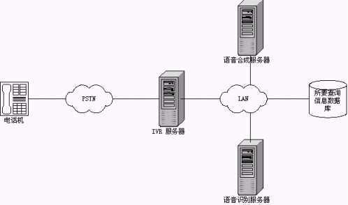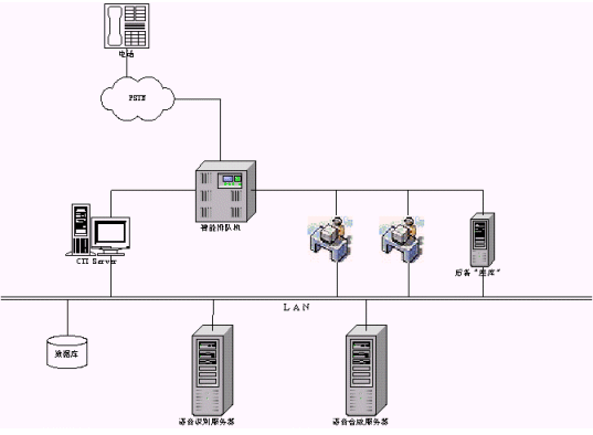 這種模式是最常見的一種接入情況。將原有煩瑣的按鍵式提示改成更具人性化的交談式語音交互,類似于語音門戶模式。這是目前大家普遍認(rèn)同的一種語音識別技術(shù)應(yīng)用方式。相比原有的按鍵方式,系統(tǒng)的新穎程度、個(gè)性化程度、用戶操作的方便程度等都得到了極大的提高,如語音識別技術(shù)在股票查詢中的成功應(yīng)用,在點(diǎn)歌系統(tǒng)中的成功應(yīng)用等;另外利用語音識別技術(shù)也解決了一些原有系統(tǒng)無法實(shí)現(xiàn)的技術(shù)難題,如火車時(shí)刻查詢、機(jī)場航班查詢等,原有系統(tǒng)借助郵政編碼、電話區(qū)號等的方式讓人無所適從,現(xiàn)在直接和系統(tǒng)交談,順利獲取所需信息,可以說是語音識別技術(shù)一個(gè)成功的應(yīng)用。這種系統(tǒng)的拓?fù)浣Y(jié)構(gòu)如下圖示: