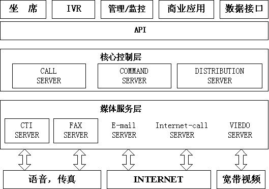 核心控制層由Call Server(呼叫控制) 、Command Server(命令服務)、Distribution Server(路由服務) 組成。Call Server用于管理呼叫信息,維護整個系統(tǒng)呼叫的狀態(tài)機;Command Server負責命令的接收和轉(zhuǎn)發(fā);Distribution Server完成路由功能。