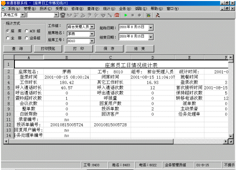 指定坐席的工作狀態(tài)(坐席工號、分機號碼、業(yè)務類型、忙閑狀態(tài)、通話時長等)