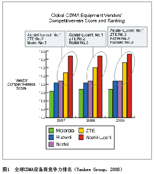 All-IP上的領(lǐng)先地位的進一步鞏固,中興通訊已經(jīng)成為全球CDMA的領(lǐng)導(dǎo)者, Yankee group 2008年的一份咨詢報告顯示,中興通訊CDMA綜合排名穩(wěn)居全球第一集團行列(見圖1)。