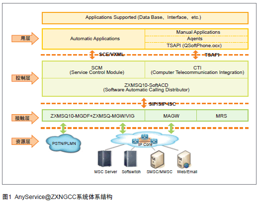 中興通訊AnyService@ZXNGCC多媒體統(tǒng)一接觸中心系統(tǒng)以中興通訊ZXMSQ10多媒體軟排隊(duì)機(jī)系統(tǒng)為基礎(chǔ),基于軟交換技術(shù)。ZXMSQ10由接入網(wǎng)關(guān)和軟排隊(duì)機(jī)兩個(gè)核心部件組成,語音、視頻呼叫(呼入和呼出)通過ZXMSQ10多媒體軟排隊(duì)機(jī)匯聚到AnyService@ZXNGCC系統(tǒng),其他媒體通過MAGW接入到NGCC系統(tǒng),同時(shí)AnyService@ZXNGCC也選擇最佳的媒體類型將信息主動(dòng)反饋給用戶,形成雙向溝通的渠道,實(shí)現(xiàn)呼叫中心系統(tǒng)的被動(dòng)服務(wù)和主動(dòng)服務(wù)。