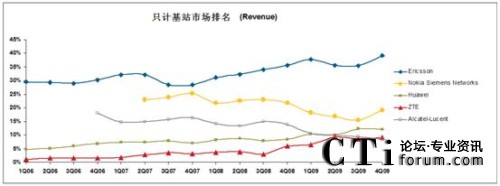 Infonetics報(bào)告顯示,受到金融危機(jī)影響,2009年全球RAN市場(chǎng)規(guī)模出現(xiàn)了9.2%的下降,從2009年的425億美金下降為386億美金。分制式計(jì),2009年WCDMA市場(chǎng)規(guī)模首次超過GSM市場(chǎng)規(guī)模,占41%,GSM市場(chǎng)在整體無線市場(chǎng)中占比下降到36%,CDMA市場(chǎng)則為16%,TD則為7%。Infonetics預(yù)計(jì),到2014年,全球RAN市場(chǎng)當(dāng)中,LTE將占據(jù)22%,GSM和WCDMA將占據(jù)約30%和42%。按照銷售收入即Revenue計(jì)算,中興通訊宏基站在第4季度市場(chǎng)份額也提升至全球無線市場(chǎng)的9.1%,同樣躍居第4。