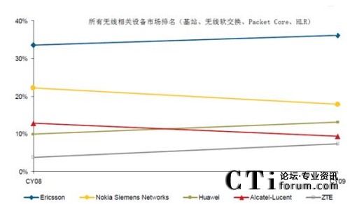 CTI論壇(ctiforum)4月16日消息(記者 潘婷婷): 近日,業(yè)內(nèi)著名調(diào)研公司Infonetics發(fā)布了2009年全球無線通信設(shè)備市場(chǎng)研究報(bào)告《2G/3G Mobile Infrastructure and Subscribers》。根據(jù)報(bào)告顯示,2009年全年,全球無線通信市場(chǎng)份額出現(xiàn)了較大變化,按載頻計(jì),中興通訊全年以12.6%的全球市場(chǎng)份額超越阿爾卡特-朗訊,居行業(yè)第4,按載頻計(jì),2009年全球無線設(shè)備出貨市場(chǎng)份額排名為愛立信、華為、諾基亞-西門子、中興、阿爾卡特-朗訊,分別為28.2%,22.1%,19%,12.6%和9.2%。