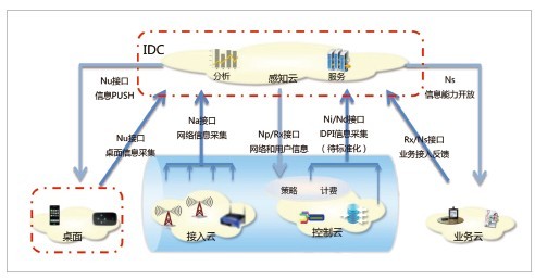 中興通訊增強端到端信息感知和開放接口,提出一套標準架構(gòu)如圖2所示,來實現(xiàn)整個網(wǎng)絡透明、可視。建設網(wǎng)絡信息采集體系,增強感知云的端到端分析能力;建立“桌面云-感知云”的云端一體化架構(gòu),提供網(wǎng)絡推送能力;感知云向終端開放網(wǎng)絡信息和能力,增強用戶感知網(wǎng)絡、定制個人體驗能力;感知云向業(yè)務開放網(wǎng)絡信息和能力,拓展合作發(fā)展增值業(yè)務的能力。