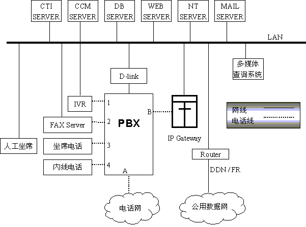 上圖所示的分布于不同地區(qū)的多個系統(tǒng)可以互相聯(lián)接,構成分布式客戶服務中心,如地市話務員回答不了客戶的問題,可轉接到省中心,話務員在坐席上操作請求CCM轉接省中心,CCM通過CTI SERVER控制PBX將A與B接通,IP網關響應呼叫,將電話號碼信號翻譯成相關的IP地址,將線路上的語音信號處理成數(shù)據(jù)信息并打包,通過本地LAN、本地ROTUER、公用數(shù)據(jù)網、省中心LAN等發(fā)送到省中心的IP網關、呼叫到達省中心PBX的B,按省中心系統(tǒng)的排隊和選擇坐席的規(guī)則選擇坐席,省中心的IP網關將接收到的數(shù)據(jù)解包還原成語音信號通過B送坐席電話3,雙方通話。這樣全省各市縣將聯(lián)結成一個大的分布式呼叫中心,同時IP電話也可用于企業(yè)內部通信,通信費將降至原來的一半以下。