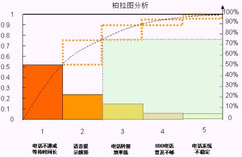 通過(guò)匯總的數(shù)據(jù)進(jìn)行分析,他們發(fā)現(xiàn)客戶不滿意的原因很多,于是選取了最大的五個(gè)原因, 用"柏拉圖"做了分析,同時(shí),對(duì)于這最重要的五個(gè)原因又作了一次頭腦風(fēng)暴和"魚(yú)骨圖分析"。