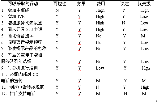 項(xiàng)目小組接下來(lái)對(duì)列舉的眾多原因合并、歸類并再次進(jìn)行頭腦風(fēng)暴,并"可控性"、"實(shí)施預(yù)期效果"、"實(shí)施費(fèi)用"、"是否可以由項(xiàng)目小組作決定"、"優(yōu)先級(jí)"等幾個(gè)方面對(duì)可以采取的行動(dòng)進(jìn)行逐項(xiàng)分析(見(jiàn)下圖),最終確定1、5、9、10、11、12項(xiàng)納入到實(shí)施方案,指定相應(yīng)的實(shí)施負(fù)責(zé)人,制定相應(yīng)實(shí)施時(shí)間表,實(shí)施時(shí)長(zhǎng)為三個(gè)月。