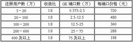 價格初期為720元/端口,后期逐年下降,每年為前期的80%。當前GK端口價格以下表為依據(jù):