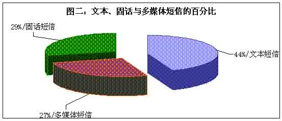 目前市場的主流短信主要有三大類,即傳統(tǒng)的手機文本短信、流行的圖音文字兼?zhèn)涞摹安市拧焙托峦瞥龅墓淘挾绦拧U麄短信市場確實火了,但是在火爆的背后哪一種短信是真正的巨無霸?調查表明,在三類短信之中,選擇文本類短信的用戶最多,占據44%,其次是固話短信,再次是多媒體短信,即俗稱的“彩信”,選擇固話短信和彩信的百分比十分接近。(見圖二)看來,“巨無霸”非文本類短信莫屬。