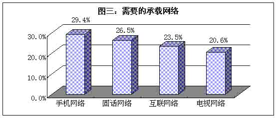 隨著各項增值業(yè)務的飛速發(fā)展,承載這些業(yè)務的網絡的格局也在靜悄悄地“變”。用戶選擇“最需要的承載”結果如圖三,雖然被調查者選擇“手機網絡”、“固話網絡”、“互聯網絡”和“電視網絡”的百分比十分接近,但是我們亦不難發(fā)現潛在的格局變化。