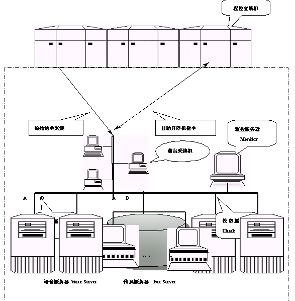 本系統(tǒng)可以分為:話單采集傳輸子系統(tǒng)、計(jì)費(fèi)帳務(wù)處理子系統(tǒng)、收費(fèi)服務(wù)子系統(tǒng)、語(yǔ)音查詢充值子系統(tǒng)、自動(dòng)開(kāi)停機(jī)子系統(tǒng)和監(jiān)控服務(wù)子系統(tǒng)六個(gè)模塊。