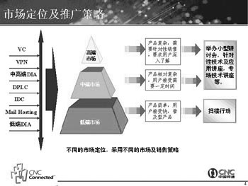 為了打開網(wǎng)通視訊業(yè)務的局面,網(wǎng)通的推廣方案也非常完備,這位負責人向記者出示了一張圖(見左下圖),詳細地解釋了網(wǎng)通視訊業(yè)務的市場定位及推廣策略。首先是通過媒體宣傳給客戶以整體印象,力求覆蓋面廣,眾所周知; 接著以直郵形式有針對性地發(fā)放詳細單頁資料,深入宣傳;然后以小型研討會、技術講座等形式,有針對性地召集當?shù)啬繕丝蛻?潛在用戶,細論VC市場及產(chǎn)品; 最后是以巡展、樣板客戶案例造聲勢,提高產(chǎn)品形象。