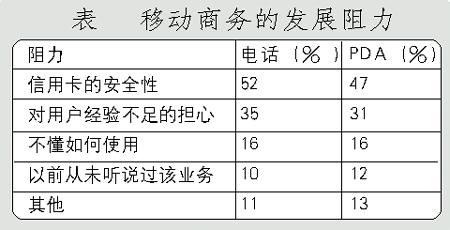 手機支付業(yè)務(wù)的進(jìn)一步發(fā)展主要受制于用戶對該項業(yè)務(wù)的接受程度。Forrester研究公司的研究表明,超過一半的被訪者認(rèn)為信用卡的安全性是移動商務(wù)發(fā)展的主要阻力。(調(diào)查結(jié)果見下表)