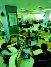 “目前這里每天要處理2000多個(gè)電話,一個(gè)月的電話量累計(jì)高達(dá)8萬個(gè)。每個(gè)坐席代表平均每天處理電話60次左右!彼上码娖鳎ㄖ袊┯邢薰矩(fù)責(zé)呼叫中心營運(yùn)的CRM推進(jìn)部副部長陳文凱說,“這是一個(gè)不輕松的工作崗位,因此,坐席代表的工作環(huán)境和工作待遇得首先得到保證。只有讓他們心情愉快,他們才能笑著去服務(wù)客戶。”這個(gè)寬敞舒適的工作大廳,就是基于這樣的思路設(shè)計(jì)出來的。每個(gè)坐席代表置身于扇形柔色的工作空間內(nèi),既能精力集中,又能避免回復(fù)電話的聲音互相干擾,一定角度的扇形空間發(fā)揮了最大的吸音效果。在大廳旁邊,還專設(shè)坐席代表休息室,每工作2小時(shí)后,他們可以到休息室休息一會(huì)。