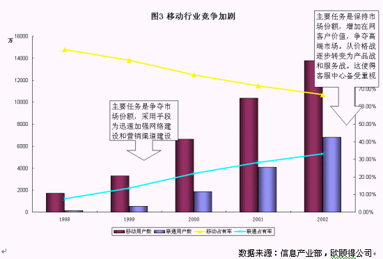 拿移動通訊業(yè)務來說,如圖3所示,截至到2002年底,中國移動的市場份額大約在65%,而聯(lián)通為35%左右,網(wǎng)絡覆蓋以及質量也越來越趨同。從國內國外的經(jīng)驗來看,移動通訊市場的競爭正從爭奪市場份額轉變?yōu)楸3质袌龇蓊~和增加客戶價值,而主要手段正也從網(wǎng)絡建設、營銷渠道建設、價格戰(zhàn)等轉變?yōu)楫a(chǎn)品戰(zhàn)和服務戰(zhàn)。在這個階段,兩家主要的運營公司都對客戶服務非常重視。服務水平的達標,投訴流程的梳理,呼叫中心的擴大規(guī)模,電話營業(yè)廳的建設等工作是今年的重點。