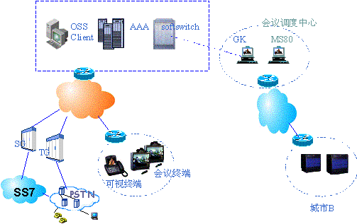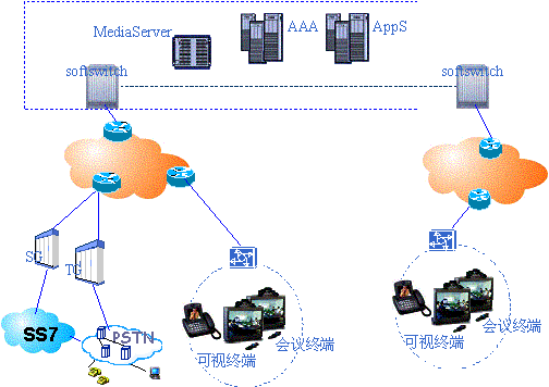 (2)點(diǎn)對(duì)點(diǎn)業(yè)務(wù)由軟交換完成,多點(diǎn)會(huì)議的控制由視訊的會(huì)議管理系統(tǒng)完成。