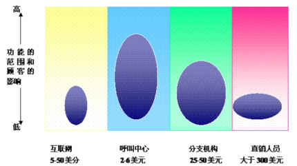 值得注意的是,外呼只是一個(gè)手段,它必須和企業(yè)的信息收集、整理、數(shù)據(jù)挖掘、市場(chǎng)策略的制訂等各個(gè)環(huán)節(jié)有機(jī)的結(jié)合起來(lái)才能發(fā)揮最大的功效。利用呼叫中心的外呼模式進(jìn)行此類業(yè)務(wù)有著其他渠道無(wú)法比擬的優(yōu)勢(shì),相對(duì)于郵件、信函、分支機(jī)構(gòu)、直銷人員等方式而言對(duì)客戶的影響力要大,而成本也相對(duì)比較便宜。下圖是著名國(guó)際咨詢機(jī)構(gòu)德勤公司對(duì)各種渠道與客戶接觸成本的分析: