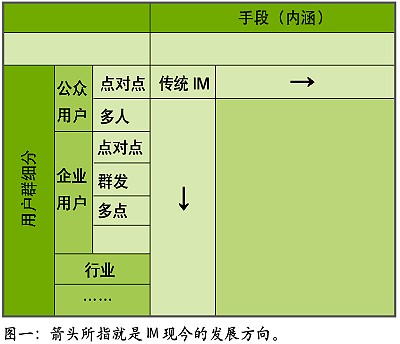 IT行業(yè)發(fā)展數(shù)十年,有一個共識,或是一種經(jīng)驗結論,大約是:在用“老工具解決新問題”、“老工具解決老問題”、“新工具解決老問題”、“新工具解決新問題”四者中,一般最先者最善,也極討巧,最后者則最為事倍功半。觀IM發(fā)展趨勢,似乎介于“新工具解決老問題”、“新工具解決新問題”二者之間,就體現(xiàn)在表中兩個箭頭上,是以錢景堪憂。