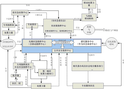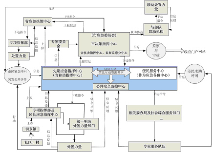 指政府決策指揮中心、先期指揮中心、便民服務(wù)中心、公共安全監(jiān)控中心,通常還有移動(dòng)指揮中心和災(zāi)備中心,以及其它節(jié)點(diǎn)的建設(shè)。一般地,先期指揮中心與便民服務(wù)中心可互為備份。政府決策指揮中心對(duì)重大、特別重大突發(fā)公共事件進(jìn)行協(xié)調(diào)、決策,偏重于自然災(zāi)害與生產(chǎn)安全方面,而一般、較重突發(fā)公共事件仍保持由各專業(yè)指揮部指揮、處置,只有當(dāng)跨區(qū)、跨機(jī)構(gòu)需要協(xié)調(diào)時(shí)由政府決策指揮中心進(jìn)行協(xié)調(diào)。