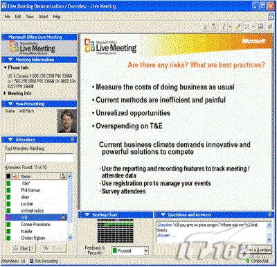 Microsoft Office Live Meeting實(shí)時(shí)會(huì)議:它使Web會(huì)議變得容易,它提供一個(gè)互動(dòng)的Web空間進(jìn)行會(huì)議。在Web空間上面,參會(huì)人員能共享文件、音頻視頻流、以及協(xié)同工作。通過Live